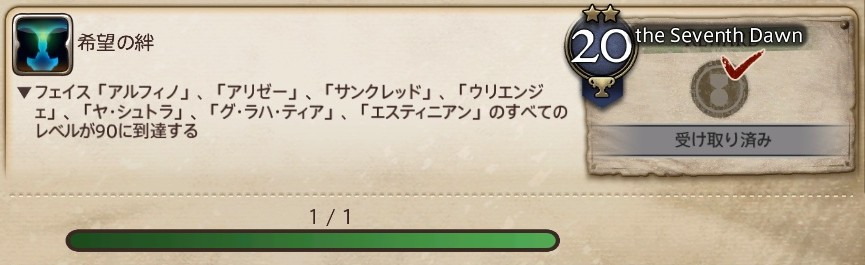 今回獲得したアチーブは『希望の絆』。もらった称号は『the Seventh Dawn』でした。